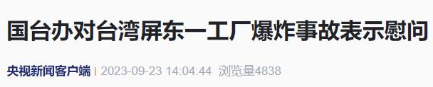 國務(wù)院臺(tái)辦發(fā)言人陳斌華23日表示,驚悉昨日下午臺(tái)灣屏東一工廠發(fā)生爆炸,造成多人傷亡。謹(jǐn)向遇難同胞表示深切哀悼,對(duì)遇難者家屬和受傷同胞表示誠摯慰問。
